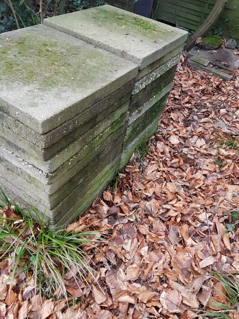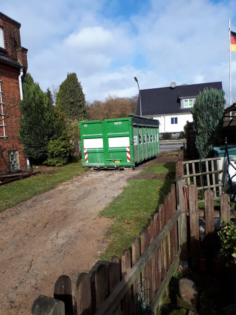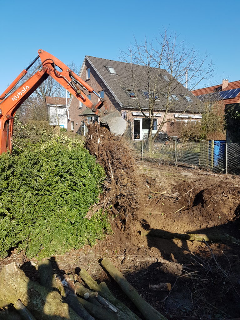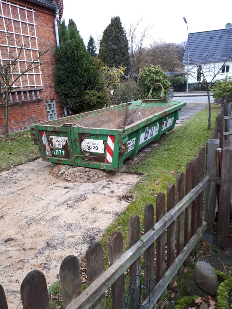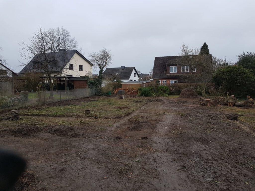 Wir mussten 4 Gewächshäuser entfernen, Büsche, Sträucher und Obstbäume mussten entfernt werden, hunderte von Gehwegplatten mussten weichen und Unmengen an Beton. Meine Großeltern benutzen den Garten um dort Gemüse anzubauen, daher wurden dort Hochbeete aus Beton geschüttet. Wir hatten soviel Beton Überreste, dass wir für die Entsorgung einen 10m³ Container bestellen mussten. In der Mitte entstand so ein riesiger Haufen von Gestrüpp.
