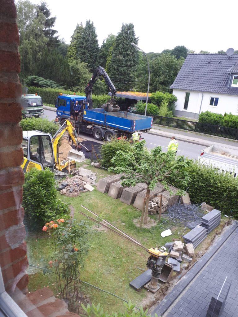 Die Bauzufahrt ist der Überfahrtsbereich zwischen öffentlicher Straße und unserem Baugrundgrundstück. Meisten liegt zwischen Straße und Grundstück was? Richtig, der Fußweg. Der ist aber für Fahrzeuge, Kräne, Bagger, eben Fahrzeuge mit mehr als 3,5 Tonnen Gewicht, nicht ausgelegt und geht bei häufigen überqueren mit solchen Fahrzeugen schlicht weg kaputt. Um das zu vermeiden bietet die Stadt Reinbek für ein haufen Geld eine so genannte Bauzufahrt an. Der Wegewart ist glücklich, die Stadt ist glücklich, wir sind ärmer. Alles gut… nicht.