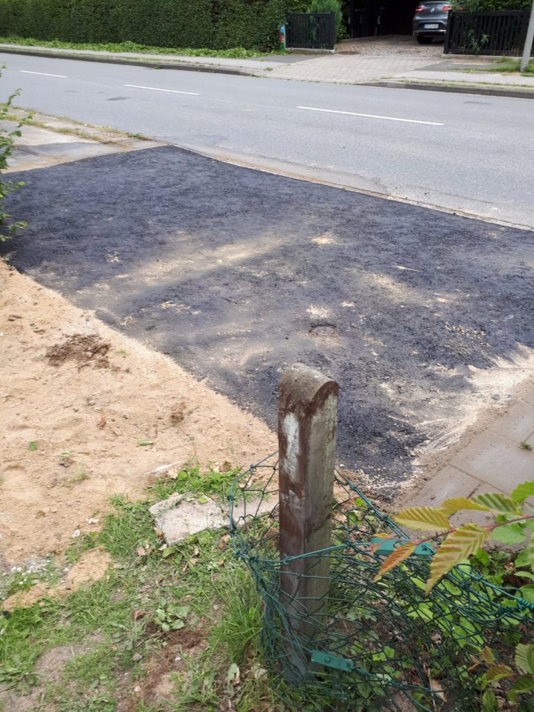 Die Auffahrt musste bei uns geteert werden, da Stahlplatten eine erhöhte Unfallgefahr darstellen. Ebenfalls wurde die Auffahrt verbreitert von 4 auf 6m. Natürlich hat man nicht darauf geachtet, dass die Einfahrt zentriert wird. So sind 2m einfach rechts „angeflanscht“ worden. Sieht nicht toll aus, aber die Stadt sichert uns zu, dass das noch richtig gemacht wird, wenn wir die Einfahrt zurück bauen lassen. Na wir sind gespannt 🙂