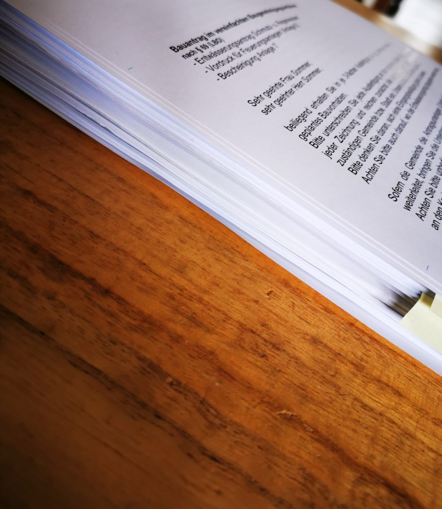 Jetzt heißt es wieder warten. Im schlimmsten Fall 12 Wochen (12 Wochen ist die maximale Bearbeitungszeit, die der Staat dafür verlagen kann und nennt sich „beschleunigtes Bauantragsverfahren“), wenn wir Glück haben kommt die Genehmigung schon eher.